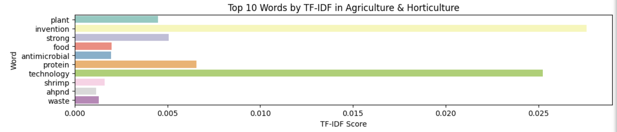 Next I wanted to test a more advanced algorithm, Latent Dirichlet Allocation (LDA). LDA is a generative model based on the bag-of-words model. LDA is a topic modeling algorithm that is used for discovering topics in a piece of text. I used the module from scikit-learn and applied the bag-of-words data to the model with a value of 13 topics (the number of potential categories the invention could be classified as).