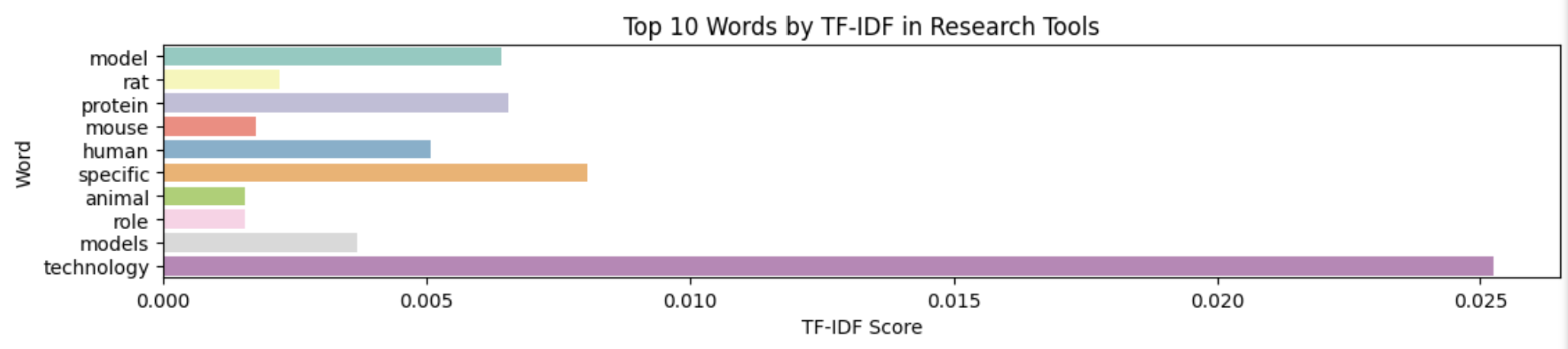 The next word-embedding model I used was the tf-idf model. This model is better at ignoring common words and places more importance to rarer words. Unlike Bag of Words, it assigns weights to words based on their importance in the document and corpus. I used the TfIdfVectorizer tool from scikit-learn to create this model, again filtering out stop words.